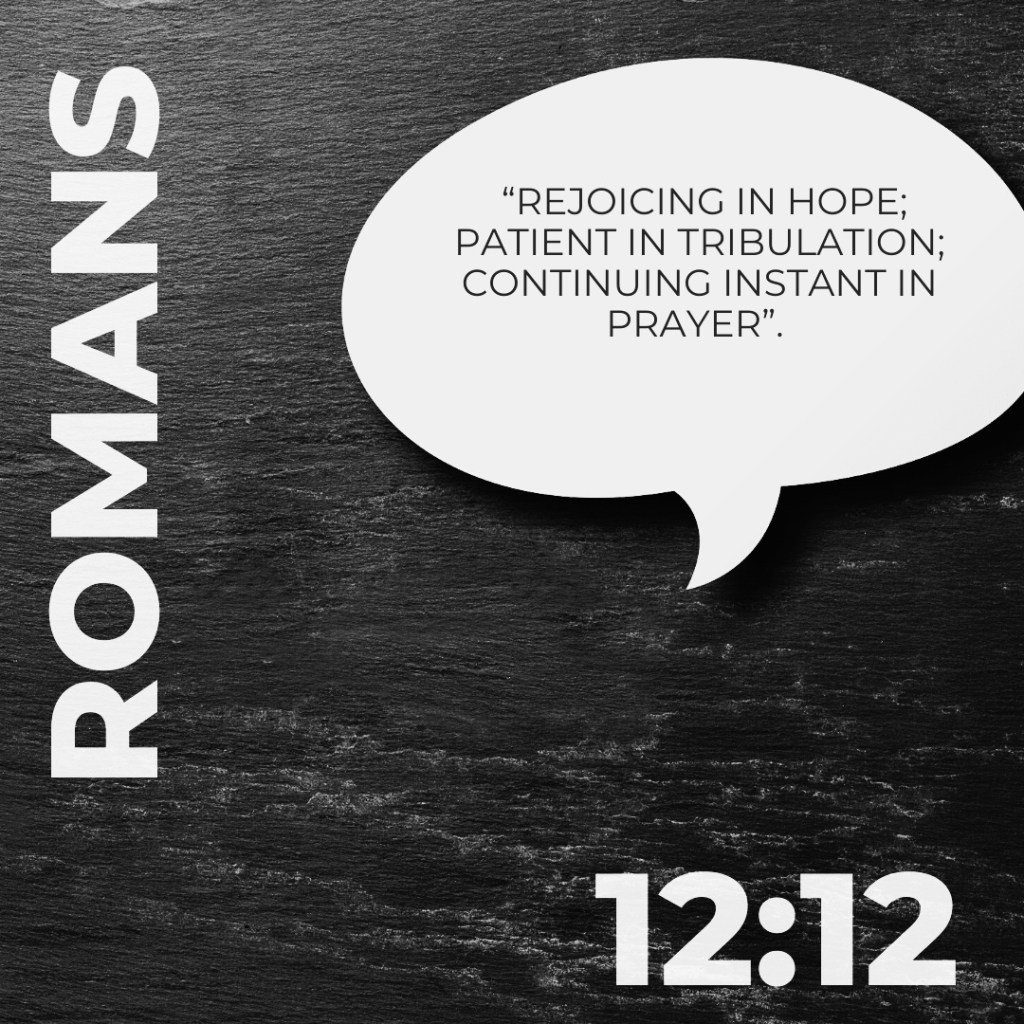 Patience referenced in Romans 12:12 translates to hupomenó which means “to stay behind, to await, endure, persevere in prayer”. Figuratively, it means to “undergo, bear, have the fortitude, to persevere”. In unfiltered, transparent and open prayer, we are received in love and guided to God’s wisdom, answers and comfort in the things we can’t explain. Love says, “I am with you always” (Matthew 28:20) .